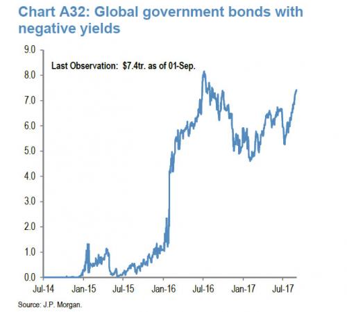 Despite some upward pressure on yields in the Eurozone, JPM reported last week that the global value of sovereign debt trading with a negative yield is $7.4 trillion, up from the low of $4.6 trillion at the start of the year.