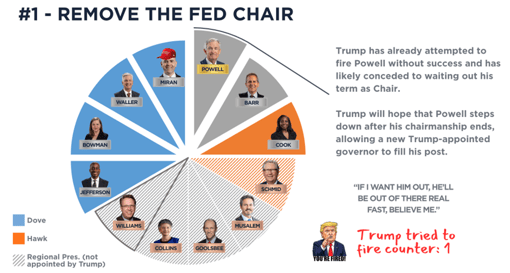 Each Governor serves a 14 year term (staggered). They are appointed by the President and confirmed by the Senate. Republicans currently have a 53-47 majority. The Fed Chair must come from one of the existing 7 Board of Governors. Miran’s term expires in January and that seat is the one Trump must fill if he wants the next Fed Chair to be someone not already on the Board of Governors.