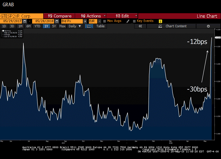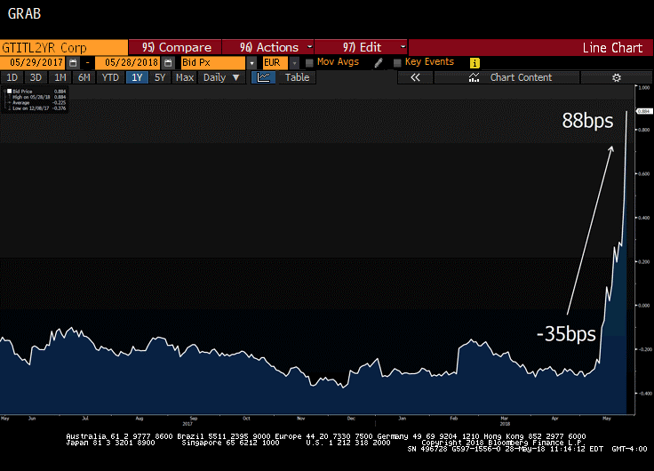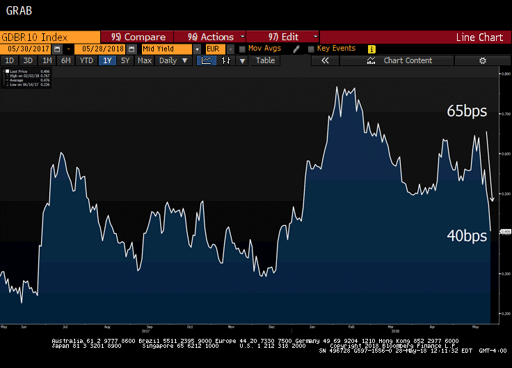 Let’s zoom in to the last month and note the plunge in yields Tuesday/Wednesday given the chaos in Italy.
