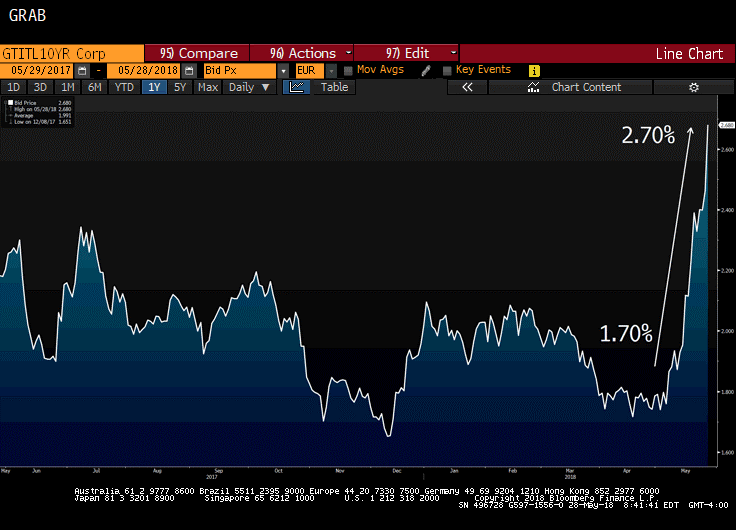 Let’s use graphs to help illustrate the effects. Check out how much the Italian 10 year bond spiked.