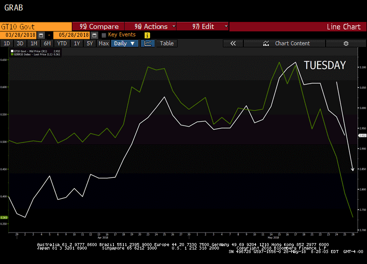 The plunge in yields was almost solely attributable to the 20bps drop in the German bund, as the chaos in Italy caused a fight to safety. The bund yield plunged, pulling the 10 Year Treasury with it.