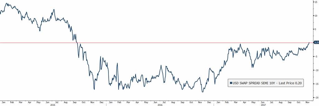 The recent nomination of Fed Governor Jerome Powell to replace Janet Yellen as Fed Chair is playing a part as well. Powell is perceived to be supportive of deregulation, and his nomination is being factored into many analysts’ predictions of swap spreads widening in 2018.